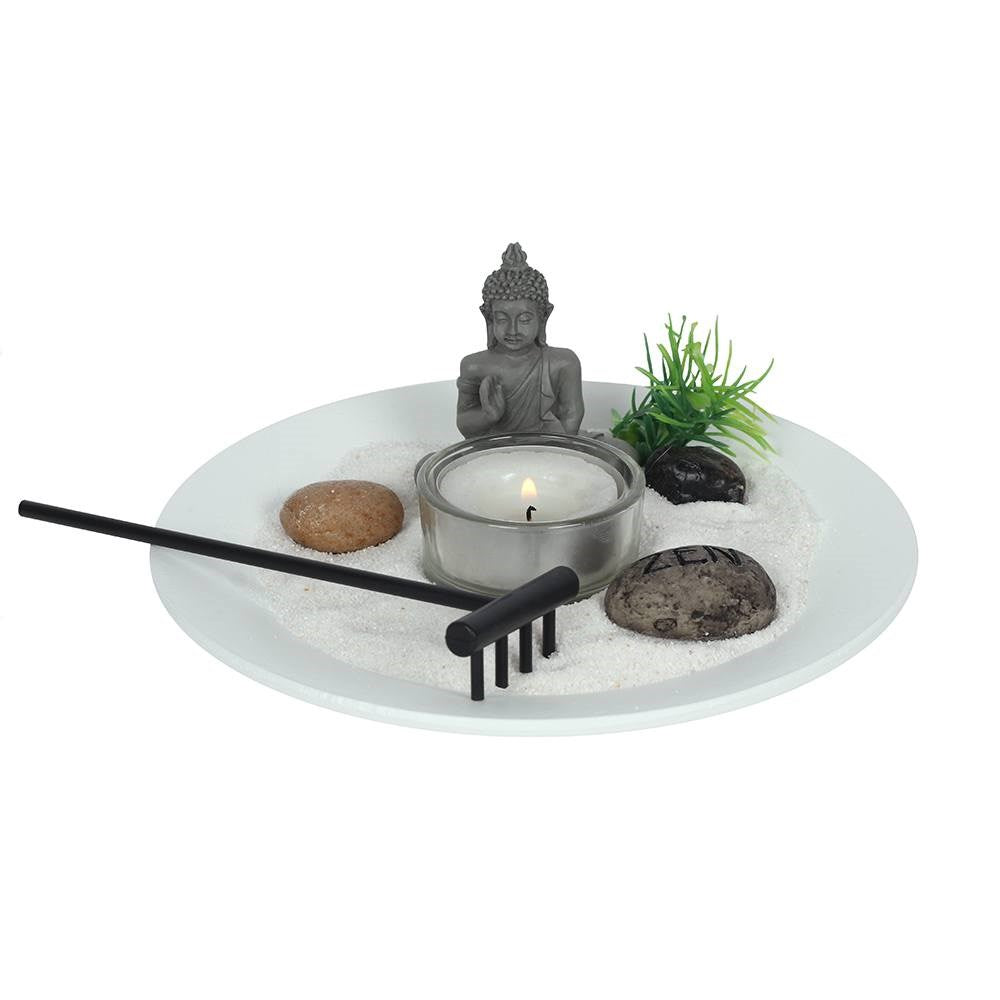 Lovely little Buddha Zen Garden set with ornament, tealight holder, gravel and rake. Perfect for adding a touch of zen to workspaces or a coffee table in the living room.