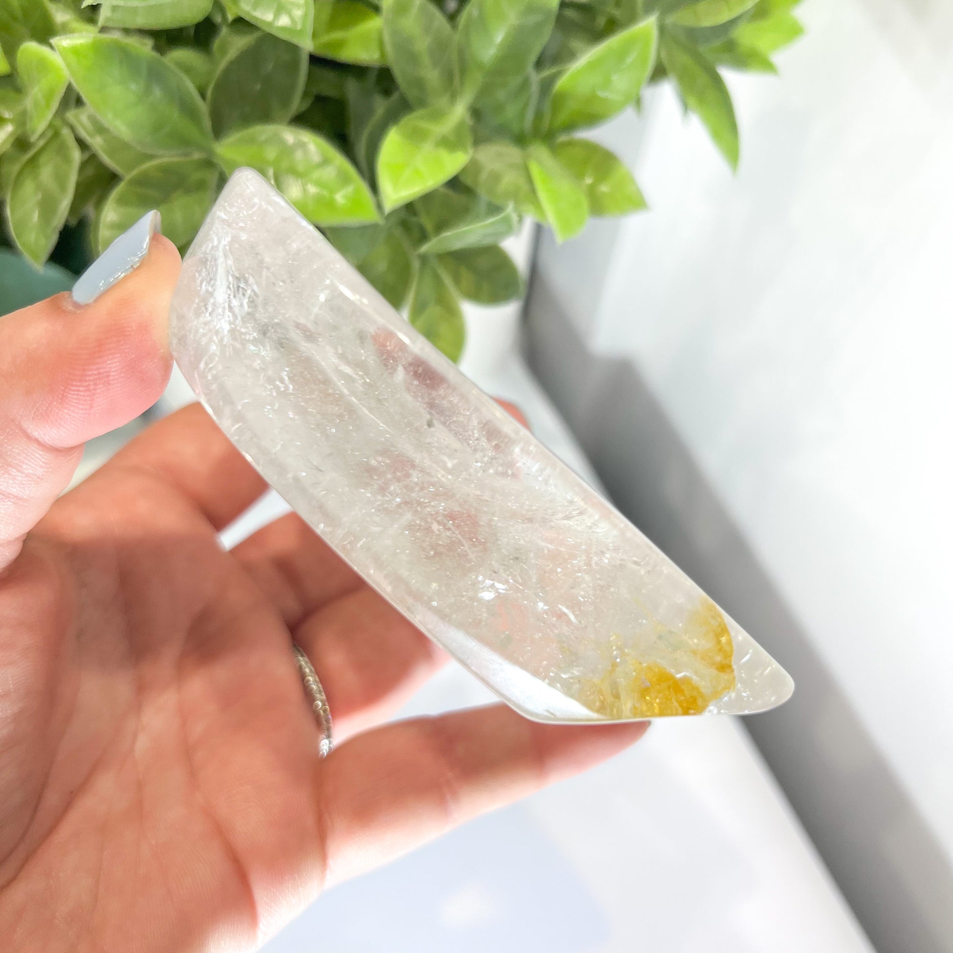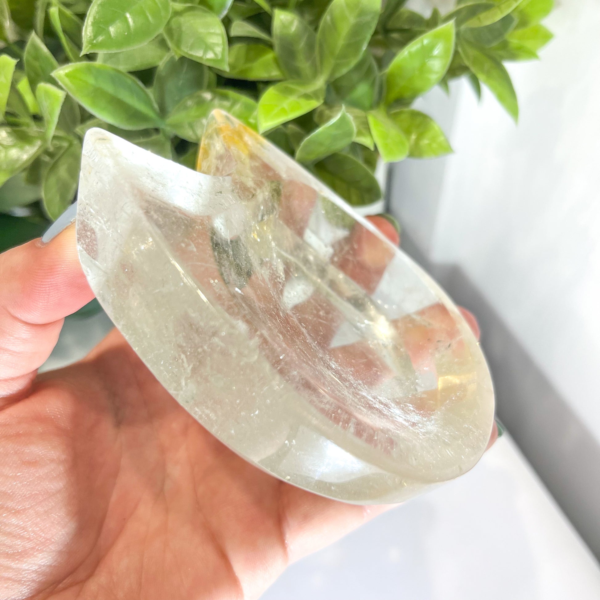 This cute clear quartz cat shaped bowl has some beautiful golden healer inclusions. Perfect for tumblestones, rings or other small accessories.