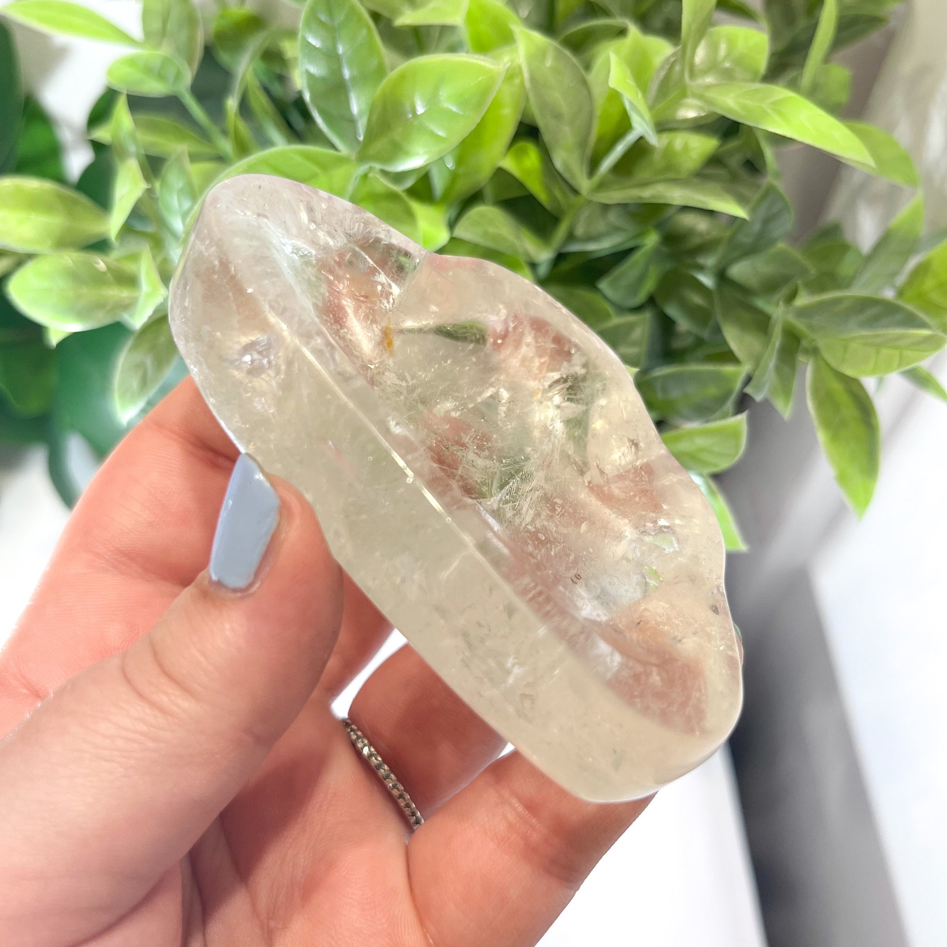 A beautiful cloud shaped clear quartz bowl with some golden healer and rainbows. Perfect for small tumblestones, rings or other small accessories.
