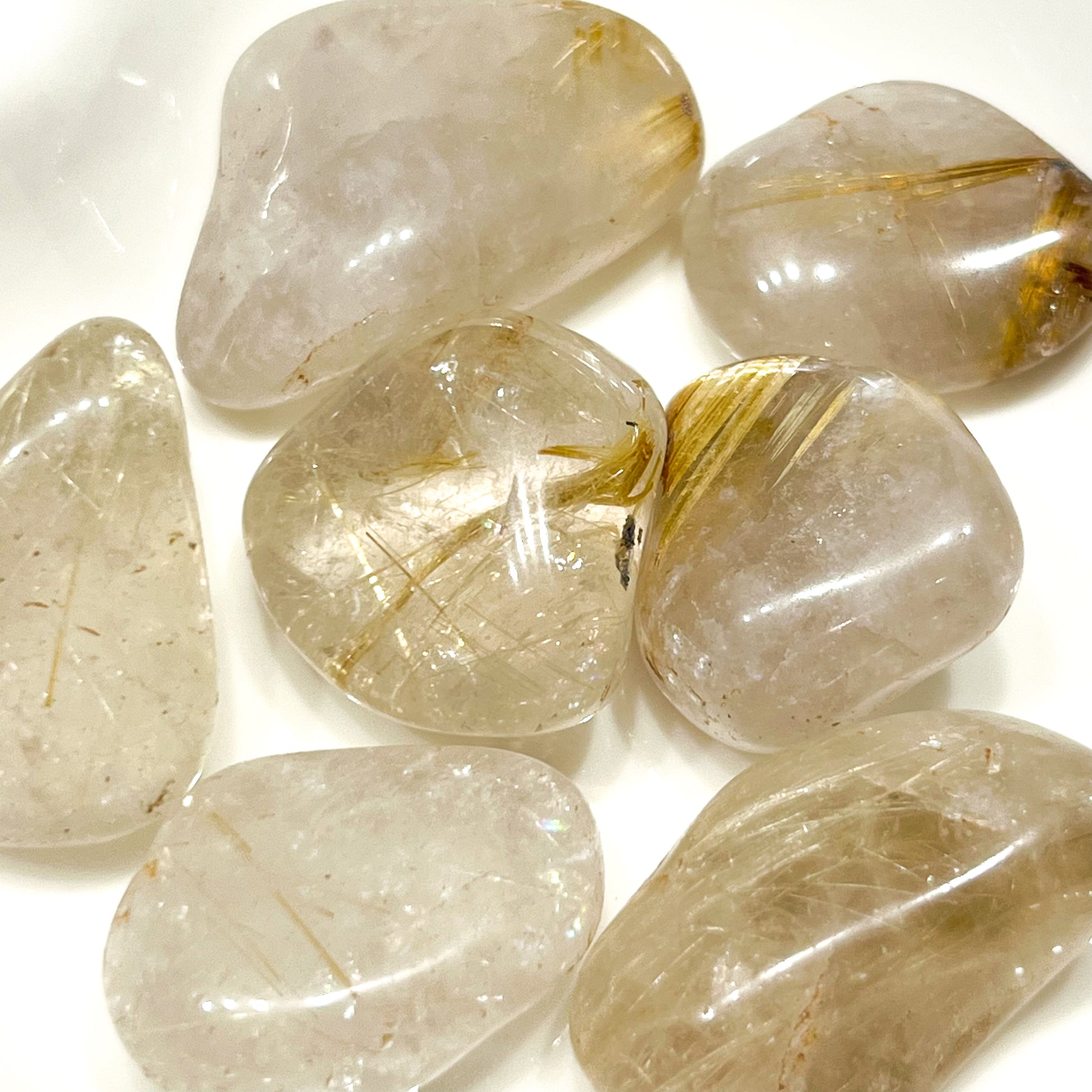 Stunning golden rutile inclusions in clear quartz. These tumblestones are approximately 20-35mm each.