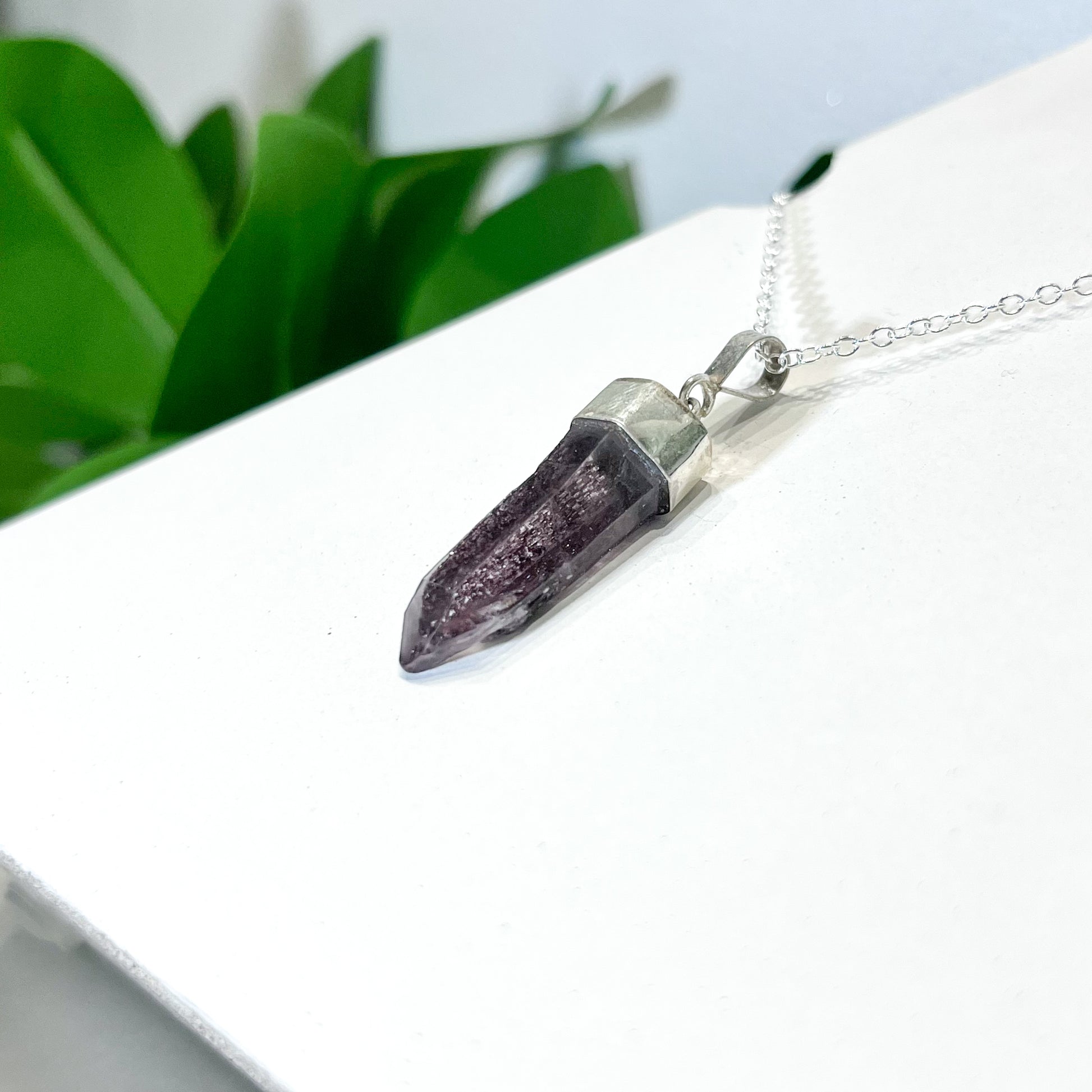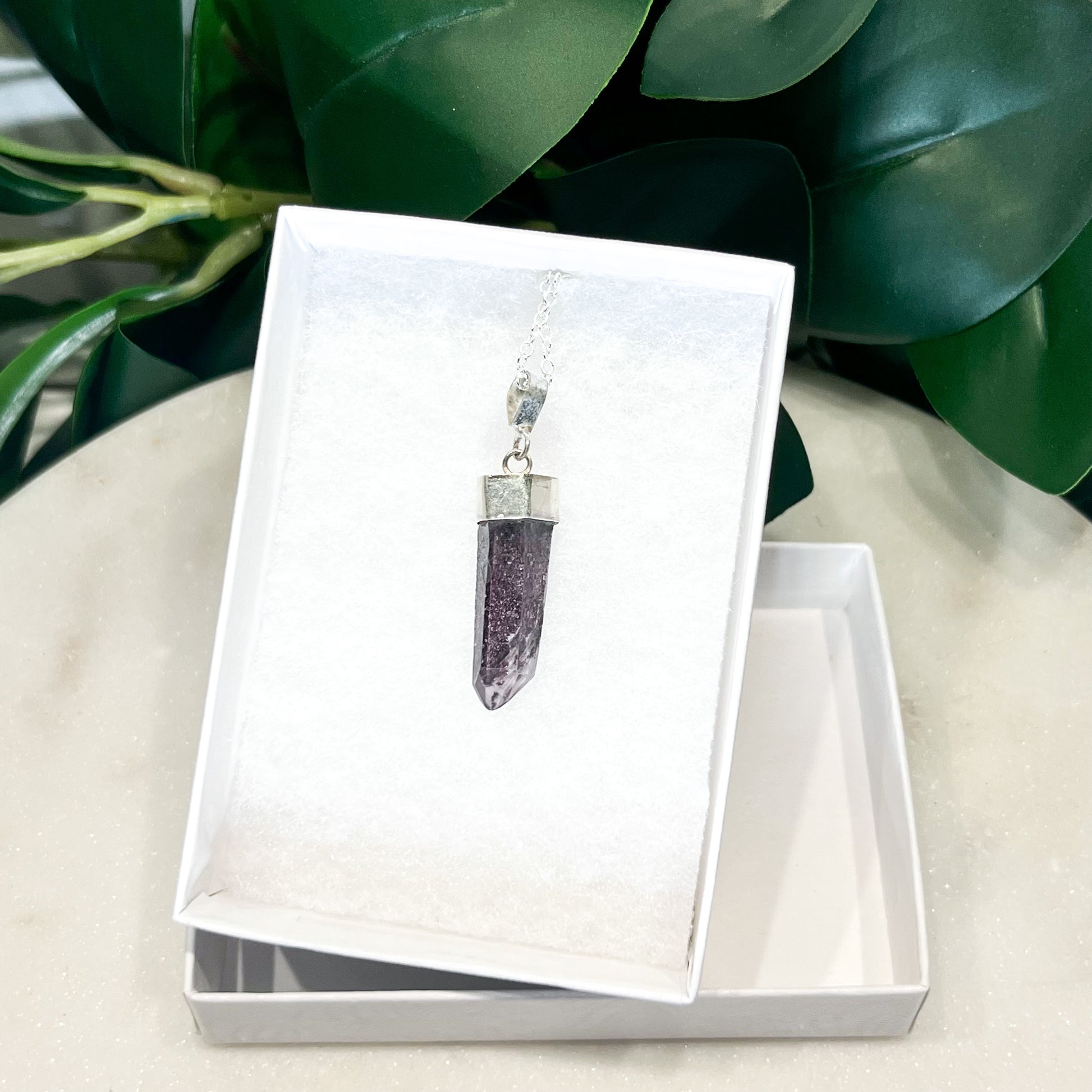 This stunning 925 sterling silver necklace is 18 inches long and features a beautiful and rare hematite quartz laser from Afghanistan. The bail of the pendant is also sterling silver. All necklaces come in a white gift box with a black bow.