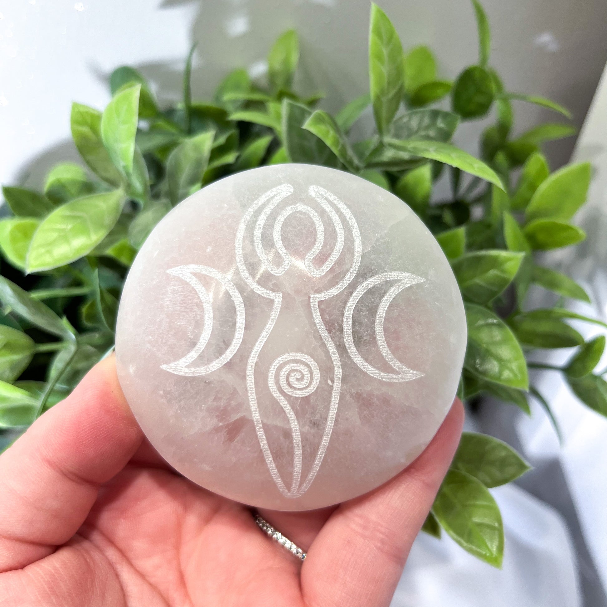 Chunky selenite palmstone with etched triple moon goddess. You may not receive the exact palmstone in the picture, but they are all very similar.