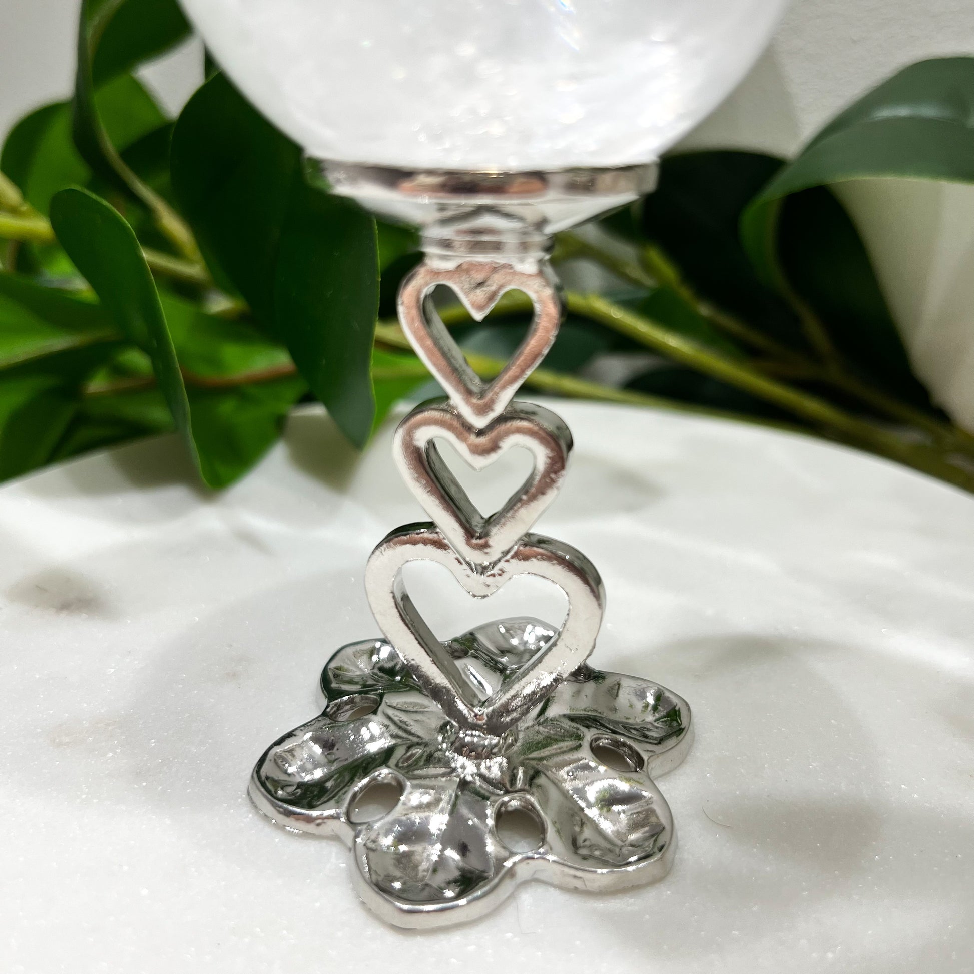 Beautiful silver sphere stand with three hearts and a flower base. The sphere on the stand is approx 30mm.