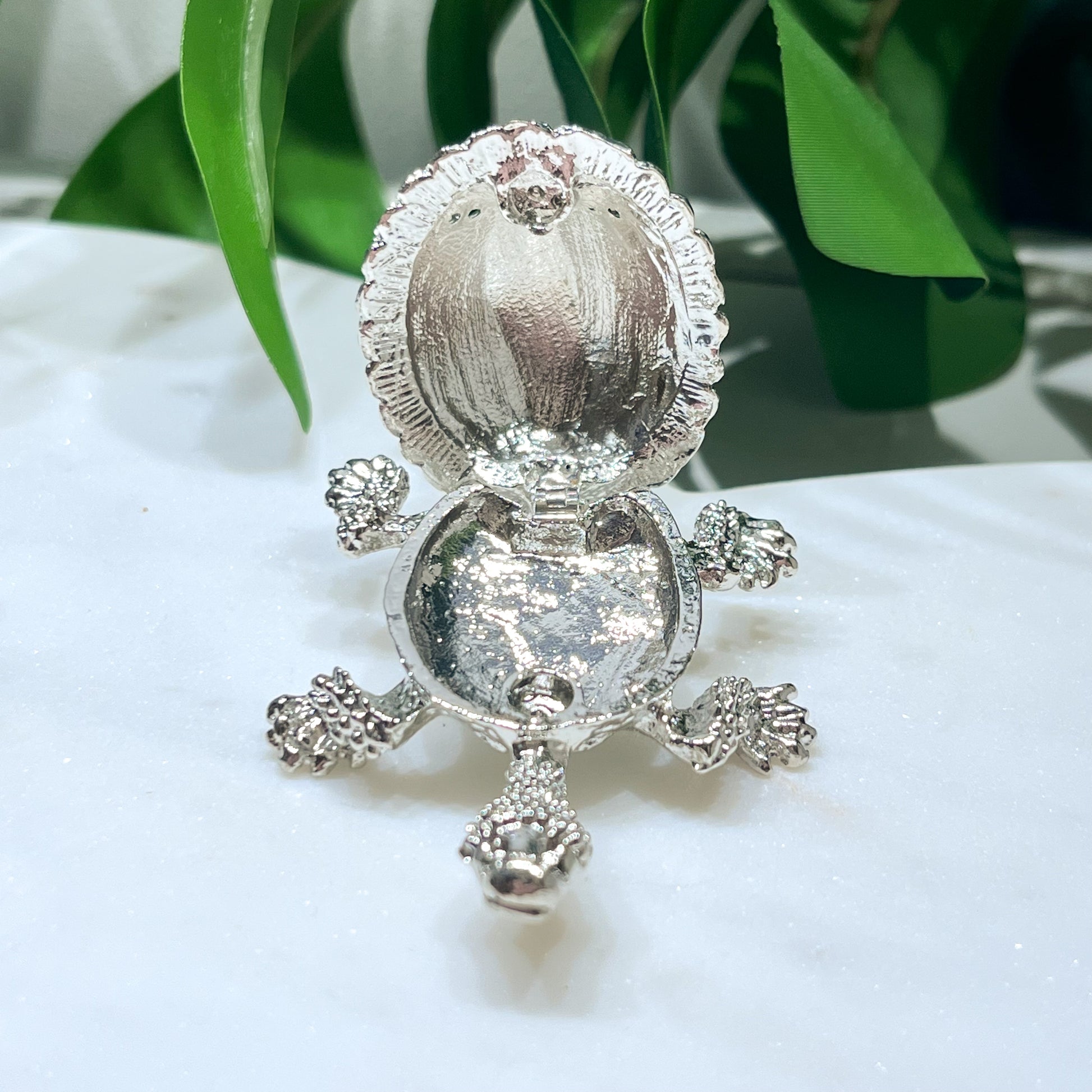 Silver turtle sphere stand. It can also be opened and used to store small pieces in such as small crystal chips or gems! The sphere shown in the picture is 37mm.